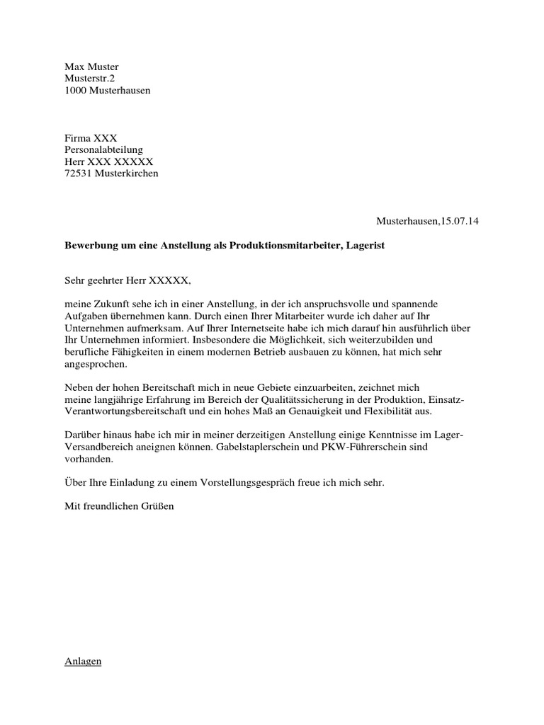 Vor dem eigentlichen Bewerbungstext steht dann die Anrede welche entweder allgemein oder noch besser personalisiert ausfällt. Muster für eine Bewerbung als Lagerist - Anschreiben Lebenslauf Deckblatt. Abteilungsleiter Lagerlogistik wmd InfraServ GmbH Co.