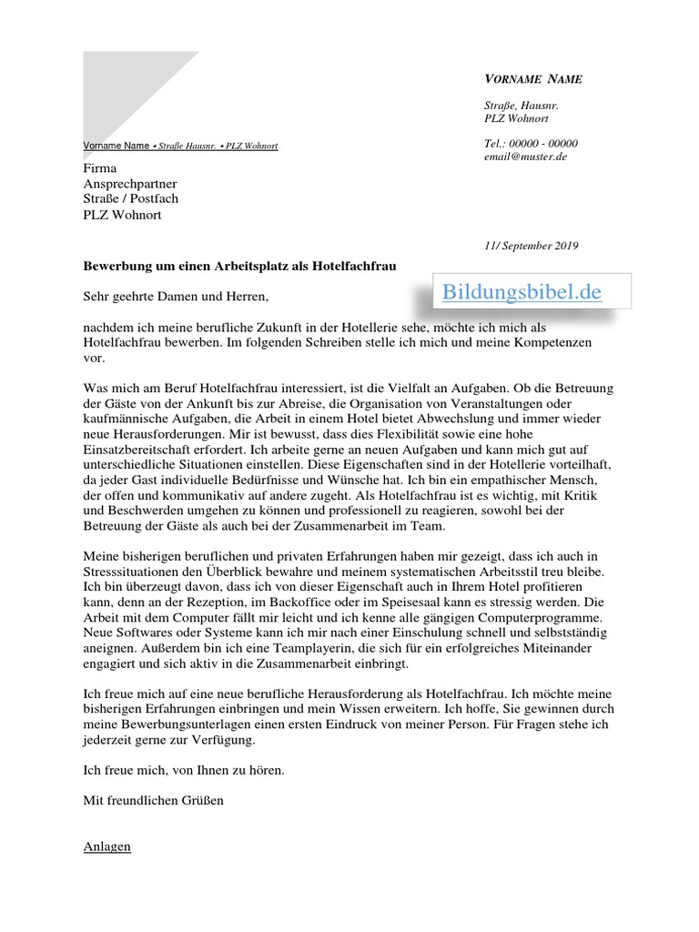 Die Vielfalt der Abteilungen hängt von der Größe des. Wenn die genaue bisherige tätigkeit schon im lebenslauf steht würde ich sie in der bewerbung nicht auch noch aufführen evtl nur kurz anssprechen. Hier siehst du ein Beispiel für die Bewerbung zur Hotelfachfrau.